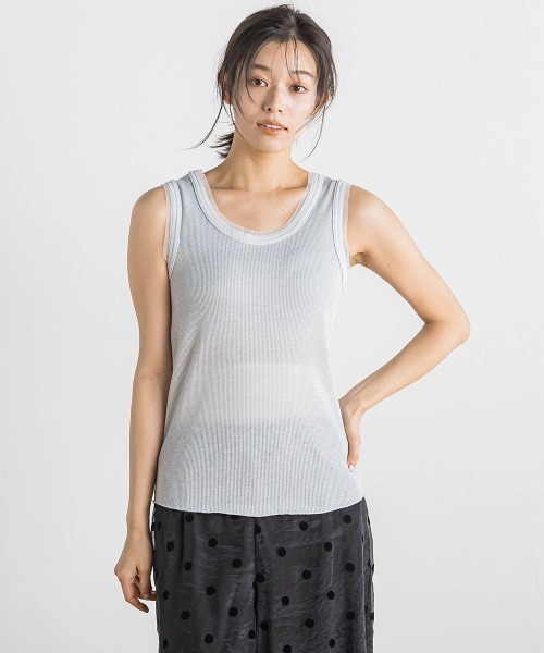 【デザインポイント・着こなしポイント】 細めの上品なリブ素材に繊細なラメをミックスしたリブタンクトップ。 襟と袖にチュール素材を施し、インナーに合わせてもポイントになってくれる1枚です。 太めの肩巾で下着を気にせず着用できるのも嬉しいポイント。 ---------------------------------------------------------------- 洗濯方法 家庭洗濯:液温は40℃を限度とし、手洗いができる。 自然乾燥:日蔭の吊り干しがよい。 アイロン:アイロン仕上げ禁止。 ドライクリーニング:石油系溶剤による弱いドライクリーニングができる。 ---------------------------------------------------------------- ※画像の商品はサンプルとなりますので実際の商品と仕様、加工、サイズが若干異なる場合がございます。 ※お客様のモニター環境により実際のお色と多少異なる場合がございます。 ※撮影状況や光の当たり具合により、色合いが異なって見える場合がございます。 ※商品タグに記載されたサイズはヌードサイズです。実際の商品のサイズは商品情報の実寸をご確認ください。 ▼商品のお気に入り登録 ハートマークをクリックし、お好きなカラーを選んでお気に入りに登録 完売カラーの再入荷通知や、ラスト1点の通知、セールの通知も受け取ることができます。 ▼ブランドのお気に入り登録 新商品や再入荷等、いち早くブランドのお得な情報を受け取ることができます。