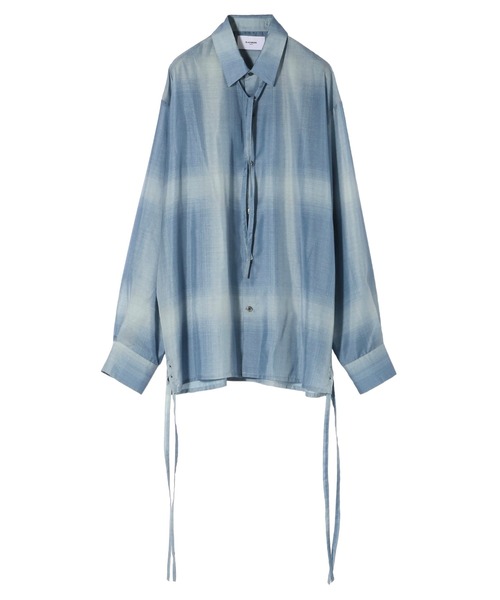 ーーー オンブレ柄のシアーシャツ。 取り外し可能な紐コードが付属し、様々な着こなしが可能。 従来のチェックシャツにはないモードな風貌です。 さらりとした肌触りの上質なスパンローンを使用しております。 ーーー ■オリジナル柄 一から制作されたオンブレチェック柄が、インクジェットで表現されています。 通常よりも大判なオンブレで、粒のような繊細なグラデーションが特徴です。 ■シアー生地 国産の上質なスパンローンを採用。 絶妙な透け感があり、夏らしい清涼感を兼ね備えております。 経糸に50d、緯糸に60dのスパン糸が用いられ、さらりとした肌触りです。 ブライト糸を使用しているため適度な光沢感があり、上品さがあります。 ■紐コード 5本の取り外し可能な紐コードが付属。 LOOKでは4本は脇に、1本を首元に着用しています。 シャツの脇スリットには裏側にボタンがついており、コードを取り付けることが可能です。 結び方や本数次第で様々な着こなしが可能です。 ■シルエット 程よくルーズカットされた心地よいシルエット。 計算されたドレープ仕立てで素材の持ち味を演出。 福島県の工場にて一枚一枚丁寧に縫製していただきました。 ■衿キーパー 芯地に加えて衿先の形状を固くする衿キーパーを羽衿部にたたき、形状をキープさせています。 衿の形状が保たれ美しく整います。 ■スタイリング ワイドからスリムまで、幅広いパンツと相性が良いです。 インナーにタンクトップを合わせたり、腰巻きやレイヤードとしても楽しめます。 コードの使い方次第でも幅広い着こなしができます。 ■コンセプト Blaymoreとして初のオリジナル柄になります。 シアー素材に適用することで希少性の高いオンブレシャツに仕上がりました。 柄に関してはかなりこだわり、ぼやけるようなグラデーションの演出を出すため微修正を繰り返しております。 紐コードも使い勝手が良いため、是非愛用してもらえたら嬉しいです。 ※撮影環境により、光の当たり具合で色味が違って見える場合があります。あらかじめご了承下さい。
