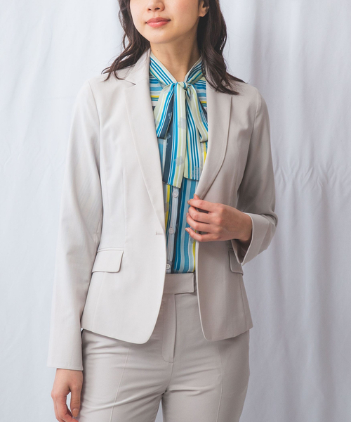 サラッとした肌触りが特徴の強撚素材で仕立てられたストレッチジャケット。テーラードカラーのデザインになっているため、襟元を美しくクラシカルな印象へと導きます。体のラインに沿うようなシェイプしたシルエットがポイント。袖口にはスリットが入っているため、腕まくりしやすいデザインに仕上げています。同素材のボトムス(30-51-08-806、30-51-09-807)とセットアップのように着用したスタイリングがおすすめです。・カラー展開はブラック、ベージュ・サイズ展開は0(S)7号・1(M)9号・2(L)11号・3(2L)13号・4(3L)15号
