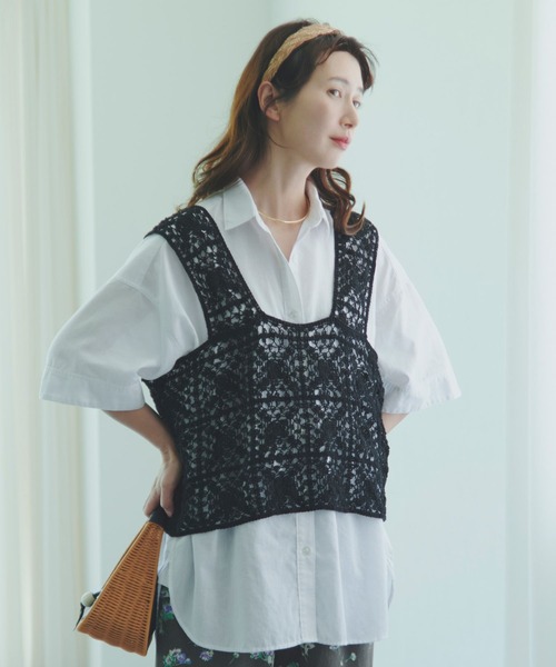 シンプルなワンツーコーデにプラスワン!コーデのアクセントになるビスチェーーー【素材】ブロック柄の編みたて生地を使用。【デザイン】トレンド感のある着こなしが叶うビスチェ。シンプルなコーデにレイヤードすることでいつものコーデがワンランクアップ◎クロシェレースがナチュラル&春らしさを演出します。透け感 :透ける伸縮性 :あり生地の厚さ :普通裏地 :なしポケット :なしクロシェ ビスチェ ベスト ジレーーー【スタイリング】シャツやブラウス、Tシャツにレイヤードすることでトレンド感のある着こなしに。ワンピースとのレイヤードもおすすめです。