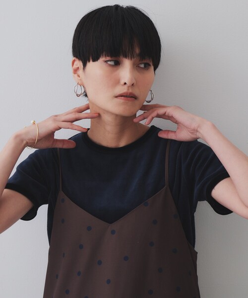 ベロアカットソーのトレンド感たっぷりなリンガーTシャツ【デザイン】・カジュアル感もある微光沢ベロアカットソー素材のTシャツです。・ネックラインと袖口を配色にしたリンガーデザインがポイント。・コンパクトなサイズ感がおしゃれで、一枚着としてはもちろん、キャミワンピースのインナーなどにもぴったりです。・チャコールグレーにブラック(514)、ネイビーにブラック(594)の配色展開。【素材】・夏でも着られるコットン(綿)/ポリエステルのベロアカットソー素材。※照明の関係により、実際よりも色味が違って見える場合があります。また、パソコン・スマートフォンなどの環境により、若干製品と画像のカラーが異なる場合もございます。モデル情報:身長166cm B72 W62 H86 着用サイズ:38(M)店舗へのお問い合わせ商品番号:637-12241●製品寸法:38(M):着丈57cm B86cm 袖丈18cm 肩幅34cm40(L):着丈58cm B88cm 袖丈18cm 肩幅35cm42(LL):着丈59cm B90cm 袖丈18cm 肩幅36cm備考: