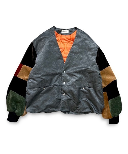 生地の段階で顔料コーティングを施した後、洗いをかけてエイジングしたVINTAGEの様なナイロン素材を身頃に使用し、袖部分はVITAGEのベルベットカーテン(70's)をパッチワークし、裏地にはひょうたんキルトのオレンジを使用したmasterkey的MA-1カーデです。 ノーカラーのデザインで全体的にバルーンシルエットに仕上げているので、中性的かつレイヤードし易いデザインになっております。 他のブランドには出来無い(自社工場だからこそ出来る)手間と希少な材料を使用したアップサイクルアイテムに仕上がっております。 *部分的にUSEDを使用しておりますが、 色合いに変化はございません。 金髪男性日本モデル①185cm size②#KAH着用 男性日本モデル②174cm size①#BLK着用 顔無し男性日本モデル③172cm size②#KAH着用 黒人男性モデル175cm size①#BLK着用 size②#KAH着用
