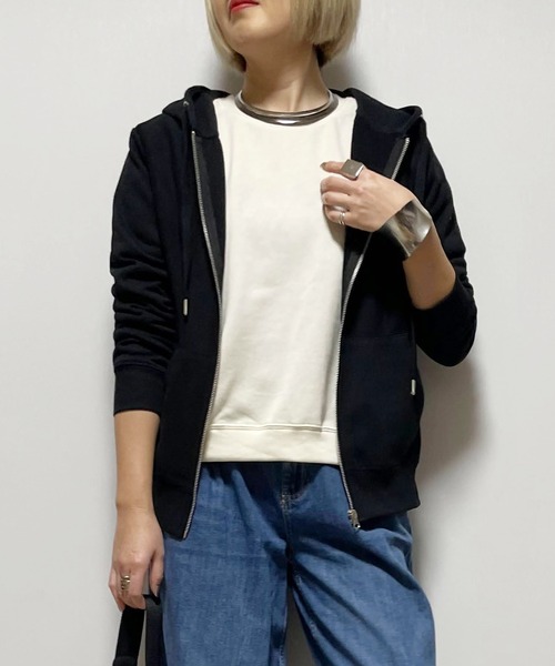 【ディテール】 使いやすい定番アイテムのジップアップフーディーは、羽織としてもジャケットのインナーとしても着用可能。ゆるっと着られるサイズ感で、ボディラインを拾わずストレスフリーな着心地。 【スタイリング】 デニムと合わせてカジュアルに、ミニスカートと合わせてガーリーにと、様々なスタイルに使いやすい1枚です。 【素材】(本体)ポリエステル65%、コットン35% (リブ)ポリエステル62%、コットン33%、ポリウレタン5% 【クリーニング】 洗濯機洗い可(ネット使用)