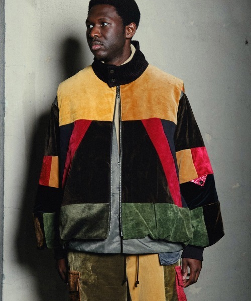 VITAGEのベルベットカーテン(70's)を解体+再構築したバルーンシルエットのベストです。裾にタックを取ることでふんわりしたバルーンシルエットを表現しております。VINTAGE素材を使用するとゴリッとした男臭いデザインに仕上がる事が多いのですが、VNTAGEベルベットならではの『妖艶な雰囲気』と柔らかい中性的なデザインにする事でmasterkeyらしいアイテムに仕上がっております。*USEDのベルベットカーテンを使用しております。 *パーツ毎に使用する色を限定しておりますので、大きく色が変わる事はございません。他のブランドには出来無い(自社工場だからこそ出来る)手間と希少な材料を使用したアップサイクルアイテムに仕上がっております。*USEDを使用する為表情は変わります。金髪男性日本モデル①185cm size②着用男性日本モデル②174cm size①着用黒人男性モデル175cm size②着用