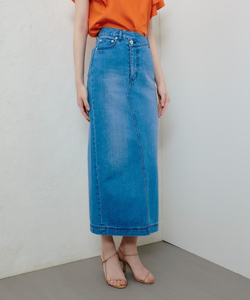 【allureville 2025 spring&summer】 12.5ozのスタンダードなデニムをキレイ目に加工し、ヴィンテージ感も出しつつ、上品でこなれた印象に仕上げたスリットタイトスカートです。 リメイクライクなウエストの仕様やゴールドのリベット、カジュアルな素材と形でありながらallurevilleらしい上品な仕上がりに。 エレガントなブラウスからTシャツまで幅広く合わせて頂きやすく、また、同素材で展開しているのボクシーシャツとセットアップで楽しんで頂くこともおすすめです。(品番:20251013380) 【スタッフコメント】 フロントのアシンメトリーデザインがおしゃれなデニムスカート。 綺麗なタイトシルエットがスタイルアップ見えに。 とても柔らかいデニム生地で着心地の良い一枚です。 長めの丈感が大人っぽい印象で、脚長効果あり。 バックスリットで足捌きもしやすいです。 オールシーズン着用可能なのも嬉しいポイント。 ご自宅でお手入れ可能です。 ※照明の関係により、実際よりも色味が違って見える場合がございます。 またパソコン・スマートフォンなどの環境により、製品と画像のカラーが異なる場合もございます。 予めご了承ください。