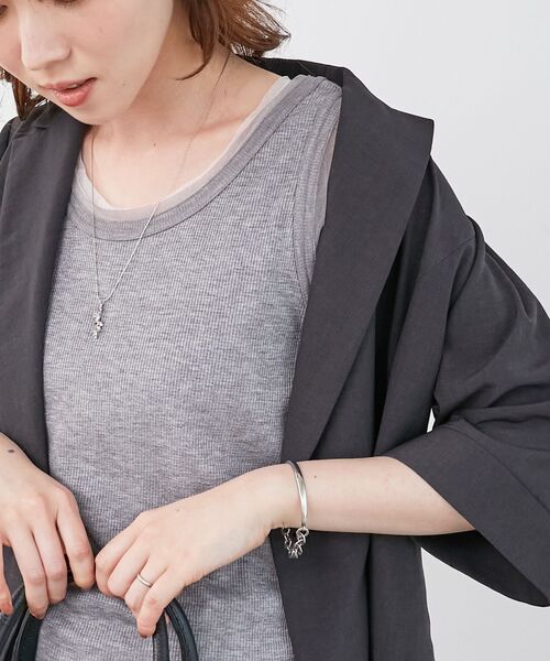 上品な光沢のラメ糸を使用したリブタンクトップです。一見シンプルなデザインですが、衿ぐりと袖口のチュール使いがディティールポイントです。キャミワンピースを重ねたり、ベストやアウターのインナー使い等にもぴったり。様々な着回しを楽しめる一枚をこの機会にぜひ。