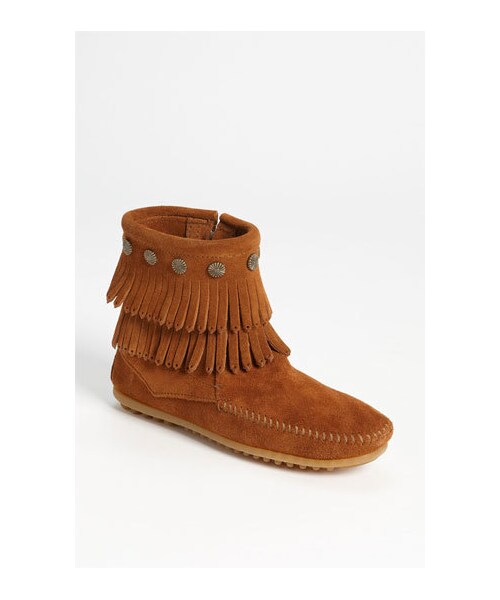 Double fringe trim complements the cross-cultural flair of a soft suede moccasin fashioned with a side zip closure for easy on and off. Approx. boot shaft height: 6". Suede upper and lining/TPR sole. By Minnetonka; imported. BP. Shoes.