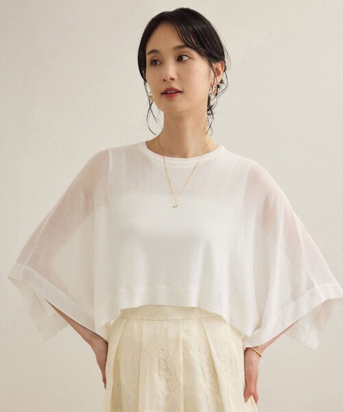 【デザイン・シルエット】 ケープとノースリーブのそれぞれ1枚でも使えて便利な2セットアイテムです。ボクシーなシルエットでシンプルなノースリーブと、スクエア型のシャープな印象のケープのひらひらと上品に揺れるシルエットがポイントです。 【おすすめのスタイリング】 ひらひらと揺れるケープでブラウスライクにスタイリングができます。カットソー素材で自然に抜け感がでてこなれた印象に。 【素材】 繊細な水撚りシアーフライス素材を使用。 水を使って撚りをかけたフライス素材で、通常の撚糸よりもシャリ感があり、さらっとドライタッチな肌触りがポイントです。 ---------------------------- 透け感:あり 裏地:なし 伸縮性:あり 光沢感:なし 生地の厚さ:薄手 ポケット:なし 開き方:かぶり ---------------------------- 【モデル情報】 ホワイト(10)着用モデル身長:165cm 着用サイズ:F 他カラー着用モデル身長:171cm 着用サイズ:F 【シアーフライス シリーズ】 同素材でデザイン違いの シアーフライス5分袖プルオーバー(品番:GGM25200) シアーフライスケープセットプルオーバー(品番: GGM25210) がございます。 ※画像の商品はサンプルです。実際の商品と仕様、加工、サイズが異なる場合がございます。 ※撮影場所やライティング、お使いのモニター環境によって色の見え方が異なる場合がございます。 ※商品のカラーは画像の色味をご参照ください。動画は仕様説明のため、色味が実物と異なる場合がございます。