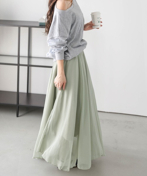 上品な透け感のあるシフォン素材 ふわりと揺れるエアリー感 ふんわりシフォンのエアリーフレアスカート 女性らしさを演出するシフォン生地で、大人ガーリーなスタイルに♪ シンプルで着こなしやすく、季節に合わせてコーデも楽しめる1着。 ふんわりとした落ち感で体型を拾わず着やせ効果も◎ レディなニュアンスシルエット ほど良い透け感のあるシフォン素材が女性らしさを引き立てます。 合わせるアイテム次第でカジュアルからフェミニンまで幅広いコーデが可能◎ 上品な透け感の楊柳シフォン生地 動くたびにふわりと揺れるエアリー感があり、ふんわりとした落ち感で 体型を拾わず着やせ効果も叶えます。ウエストは総ゴム仕様で ストレスフリーな穿き心地なのも嬉しいポイント◎ ■Fabric ふんわりとした落ち感があり、上品な透け感のシフォン生地 --------------------- 透け感:あり 裏地:あり 厚さ:薄手 伸縮性:なし -------------------- ▼《お気に入り登録》でお得な情報がいっぱい▼ ・「商品のお気に入り登録」で再入荷通知や、ラストの通知、セール通知も受け取ることができます。 ・「ブランドのお気に入り登録」で新商品や再入荷など、お得な情報を受け取ることができます!