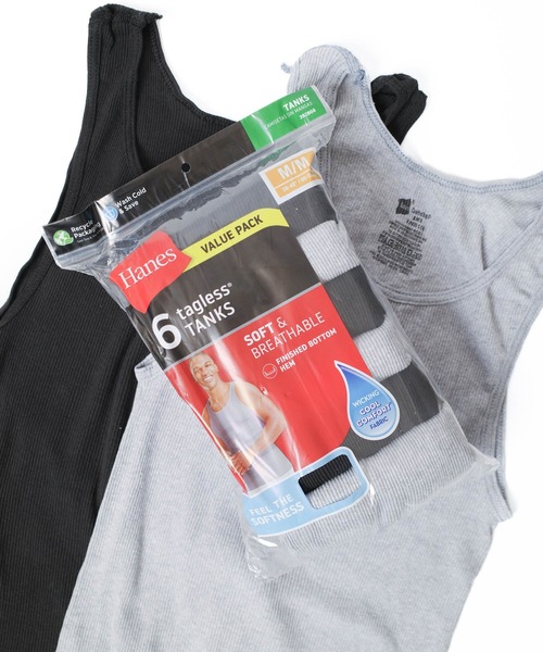 100年以上の歴史を誇る『Hanes(ヘインズ)』の王道のタンクトップ 【デザイン】グレー3枚&ブラック3枚の計6枚入りのタンクトップパック。 柔らかく軽量で、吸湿発散性に優れたCool Comfort®素材を使用し、涼しく快適な着心地をキープします。 ゆったりとした丈感で、裾はきちんとタックインされ、バンド付きのスクープネックとアームホールは、何度洗っても抜群の丈夫さをキープ。 さらに嬉しいのは、タグレスデザインでチクチクしない快適な着心地。 伝統的なリブ編みによる伸縮性のある生地とゆとりのあるアームホールが特徴的です。 【Hanes/ヘインズ】 アンダーウェアのパイオニアとして、100年以上の歴史を誇る【Hanes(ヘインズ)】は、1901年にP.H.ヘインズとその弟によって設立されました。 現在では当たり前となったブリーフ、トランクス、タンクトップ、サーマル等、当時としては画期的な商品を次々と開発し、全米アンダーウェアマーケットでの地位を確立すると共に、映画フィルムでの着用やプロスポーツ選手の広告起用によって世界レベルでの認知度へと成長。パックTシャツ等、アメリカ人の生活において欠かすことの出来ないヒット商品を開発する一方で「SUPREME」や「STUSSY」といったストリートブランドとのコラボレーションを活発に行い、ストリートシーンの最先端に商品の供給を行っている。