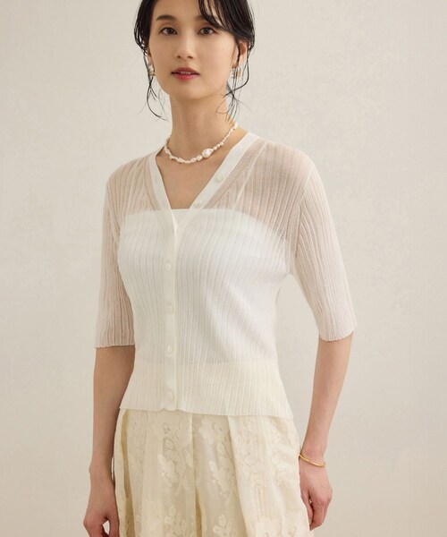 【デザイン・シルエット】 Vネックのコンパクトな五分袖カーディガン。フロントを上まで留めたり、少し開けたラフなアレンジも決まりやすく、羽織だけではないスタイリングを楽しめるアイテムです。上2つの釦はかざりになっています。 【おすすめのスタイリング】 ショート丈なのでノースリーブのワンピースの上にさらっと羽織っていただいたり、ジャストウエストのタックパンツなどのボリュームのあるボトムに合わせていただくのがおすすめです。 【素材】 柔らかい風合いのワイドリブニット。極細番手のコットンナイロンの糸を使用し、繊細なシアーに編立ています。 ---------------------------- 透け感:あり 裏地:なし 伸縮性:あり 光沢感:なし 生地の厚さ:薄手 ポケット:なし 開き方:ボタン ---------------------------- 【モデル情報】 モデル身長:171cm 着用サイズ:F 【シアーリブ シリーズ】 同素材でデザイン違いの リブニット(品番: GGM25160) リブカーディガン(品番:GGK25160) がございます。 ※画像の商品はサンプルです。実際の商品と仕様、加工、サイズが異なる場合がございます。 ※撮影場所やライティング、お使いのモニター環境によって色の見え方が異なる場合がございます。 ※商品のカラーは画像の色味をご参照ください。動画は仕様説明のため、色味が実物と異なる場合がございます。