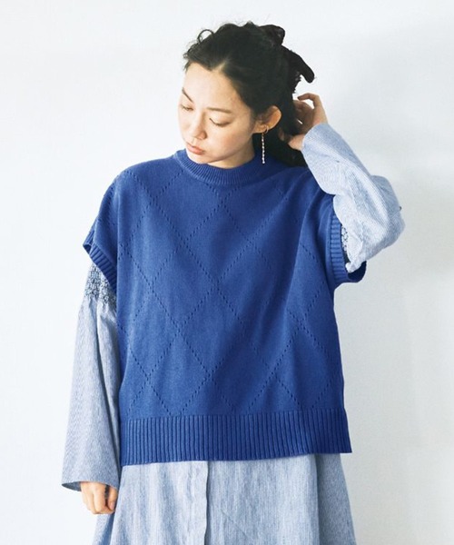 ダイヤ模様にアイレット編みをほどこしたゆったりシルエットのニットベスト。鮮やかなロイヤルブルーで作りました。着ると半袖のようになるオーバーサイズで、この春は「スモッキングストライプワンピース」と着合わせ、袖のスモッキングをのぞかせてみました。お手持ちのワンピースやトップスとのコーデをぜひおためしください。 ※フェリシモの商品には、紐などでくくられている紙タグは付属しておりません。