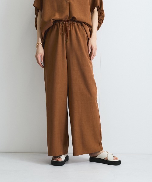 ●POINTウエストはぐるりゴム仕様で、ドロストコード付きプルオンタイプのイージーパンツです。セミワイドシルエットでイージーなのに、ゴールドのコードエンドできちんと感も感じられ、着用シーンも幅広いアイテムです。チョークストライプ柄の2色(ライトグレー×ブラックライン、ネイビー×ホワイトライン)と無地カラー3色(サックスブルー、ブリックブラウン、チャコールグレー)での展開です。同素材の展開には、タンブレーブッチャーブラウス(2313-52028)がございます。●FABRIC程よいハリ感でボディラインを拾いにくく、ドライなのに滑らかなテクスチャーです。シワやピリングになりにくい、イージーケアの麻調合繊のテキスタイルを使用しています。----------------------------------透け感:淡色のみややあり厚さ: やや薄い伸縮性:なし裏地: なしポケット: あり--------------------------------------------------------------------------------------------------洗濯方法家庭洗濯:液温は40℃を限度とし、手洗いができる。自然乾燥:日蔭の吊り干しがよい。アイロン:底面温度160℃を限度としてアイロン仕上げができる。ドライクリーニング:石油系溶剤による弱いドライクリーニングができる。----------------------------------------------------------------■モデル身長 165cm 着用サイズ M※画像の商品はサンプルとなりますので実際の商品と仕様、加工、サイズが若干異なる場合がございます。※お客様のモニター環境により実際のお色と多少異なる場合がございます。※撮影状況や光の当たり具合により、色合いが異なって見える場合がございます。▼商品のお気に入り登録ハートマークをクリックし、お好きなカラーを選んでお気に入りに登録完売カラーの再入荷通知や、ラスト1点の通知、セールの通知も受け取ることができます。▼ブランドのお気に入り登録新商品や再入荷等、いち早くブランドのお得な情報を受け取ることができます。