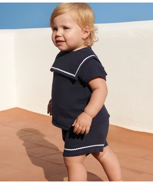 セーラーテイストあふれるとってもキュートなベビー2点セットです。環境に優しく、2枚の生地で織り上げた軽くてやわらかな肌触りのガーゼを使用し、ナチュラルな着用感を実現しています。お着替えが簡単にできるよう、トップス背面にスナップボタン、ボトムスはゴムウエスト仕様になっているので安心。リゾート感あるセーラーカラーがデザインのポイント。動きやすさもオシャレもが叶えた、ギフトにも大変喜ばれるセットです。※素材の特性上、強い摩擦が発生したり、バッグの金具やアクセサリーなどに糸が引っかかる場合がありますので、お取り扱いの際はご注意ください。