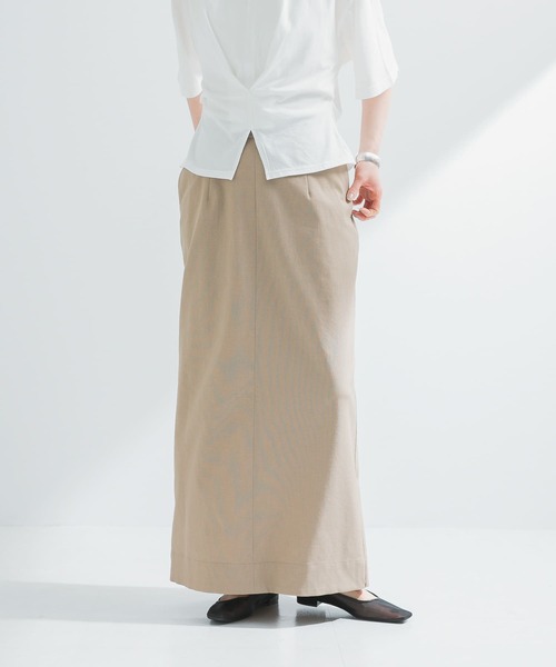 清涼感のある上質なリネン混のロングスカート。 日本の上質なリネン混素材は、ナチュラルなはり感と柔らかさ、フラットになりすぎない表面感が特徴で、夏でも快適に着られるドライな肌ざわりです。 デザインは、シンプルでストレートなシルエットで、洗練された印象に仕上げました。正面はすっきりとしたシルエットながらも、ウエストの後ろがゴム仕様なので、動きやすく快適な着心地を実現。また、後ろの裾にはスリットが施されており、抜け感をプラスしました。 ノースリーブのニットやカットソーとのスタイリングがおすすめ。軽やかで大人な雰囲気に導きます。 POINT ・清涼感のあるリネン混 ・上質な日本製素材 ・選べる2サイズ展開 ・快適なウエストゴム仕様 【2025 Spring/Summer】【25SS】 ※商品画像は、光の当たり具合やパソコンなどの閲覧環境により、実際の色味と異なって見える場合がございます。予めご了承ください。 ※商品の色味の目安は、商品単体の画像をご参照ください。 ▼お気に入り登録のおすすめ▼ お気に入り登録商品は、マイページにて現在の価格情報や在庫状況の確認が可能です。 お買い物リストの管理に是非ご利用下さい。 素材感 透け感 : なし 伸縮性 : なし 裏地 : なし 光沢 : なし ポケット : あり 3638