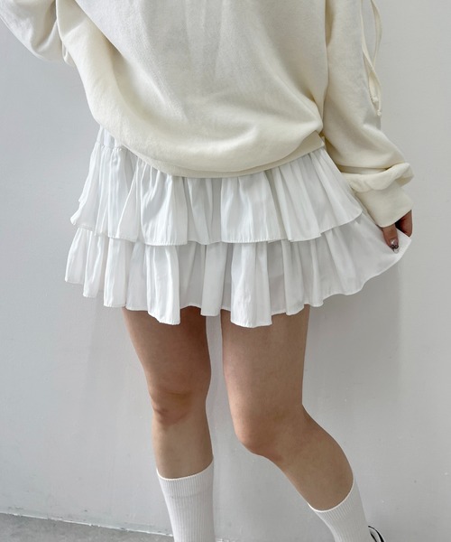 ふんわり揺れる2段ティアードスカートややハリのある生地でふんわりとしたシルエットをキープしつつ、お腹ゴム仕様でストレスフリーな着心地!インパン付きなので一枚でも安心して着られます。ベーシックな白と黒のカラー展開なのでどんなトップスとも合わせやすく、デイリーにもお出かけにも◎かろやかで女性らしい印象を演出してくれる、大人ガーリーな万能スカートです。▼便利なお気に入り登録▼商品のお気に入り登録で、再入荷の通知・ラスト1点・お得なセールの通知を受け取ることができます。ブランドのお気に入り登録で、新商品や再入荷など、さらにお得な通知を受け取れます。《Attention》・撮影はサンプル品を使用しており、実際の商品とは仕様や加工・サイズ等が若干異なる場合がございます。・撮影場所や照明の照射・角度、お使いのモニター環境により色味や仕様、加工、カラーが若干異なる場合がございます。・商品によっては1〜3cm程度の採寸誤差がある場合がございます。・移染等防止のため水や汗で濡れたまま放置することは避けて頂き、濃色アイテムは単体でのお洗濯をお願い致します。・素材臭がある場合は陰干しをお願いいたします。・アテンションタグを必ずご確認の上ご使用下さい。