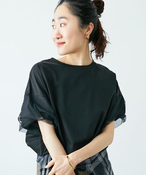 袖のデザインがポイントの1枚着カットソー。袖のねじりデザインとチュールの異素材使いがアクセントになり、シンプルなTシャツと差をつけ1枚で主役になれるアイテム。コーディネートに奥行きをプラスしてくれます。上品な光沢感と滑らかな肌触りが特徴の素材を使用し、コットン100%で通気性がよく着心地も抜群。●ポイントリラックス感のあるシルエットで体型を問わず着て頂きやすく、袖の華やかなデザインとボリュームで気になる二の腕も自然にカバーできるのも嬉しいポイントです。●おすすめコーデ春夏は1枚で、秋冬はジャケットやカーディガンのインナーとしても◎オールシーズン使える素材感で、着回し力高くこれからの季節におすすめです。【スタッフ着用コメント】〈スタッフA〉40代前半/152cm/骨格ウェーブ/普段サイズS‐M/着用サイズ38サイズ感:スリーブのデザインが二の腕をカバー。程よいゆとりあり。素材感: Tシャツ生地にチュールスリーブの異素材がブラウスの様な奥行きのあるトップスに見せてくれる。着用感:インナー合わせでも一枚着でも華やか。着映えるTシャツとして大活躍。〈スタッフB〉20代後半/158cm/骨格ストレート/普段サイズM/着用サイズ38サイズ感 : 全体的に程よいゆとりがあるので体のラインも気にならないです。素材感: サラッと滑らかな素材感。袖のチュール素材もやわらかめ。着用感: カットソー生地で着心地◎袖のチュールデザインがさりげなく女性らしい印象。※取り扱いについては、商品についている洗濯表示にてご確認下さい。※照明の関係により、実際よりも色味が違って見える場合がありますまたパソコン・スマートフォンなどの環境により、若干製品と画像のカラーが異なる場合もございます。※商品の色味は、商品アップ画像をご参照ください。【注意事項】・画像の商品はサンプルです。・サイズ表記はあくまで目安となります。 実際の商品と仕様、加工が若干異なる場合があります。