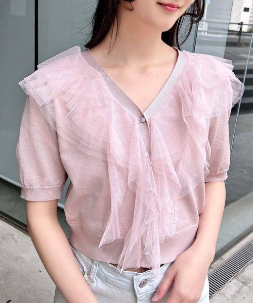 【トレンドのニット×チュールの異素材ドッキングトップス◎】 ▼Design フロントにはフリルチュールを施し、軽やかでエレガントなデザイン◎ 春夏にもぴったりなトップスに♪ トップスとしてもカーディガンとしても着用いただけ、一枚あると便利なアイテムです◎ やわらかくなめらかでさらりとした素材は肌触りが心地良く、フィット感も良いです。 ▼Styling ワンピースの上に羽織るのはもちろん、カジュアルなボトムとのあわせもおすすめです。 チュールがアクセントになるのでシンプルなボトムと合わせてトップスを主役にしていただくのも◎ ・ニット製品のため生地に伸縮性があり、サイズに若干の誤差が生じる場合がございます。予めご了承くださいませ。 【以下サックス参考。カラーにより多少の誤差あり】 ・透け感:やや透ける ・伸縮性:あり ・生地の厚さ:普通 ・裏地:なし ▼Recommend ・チュール ・ドッキング ・サマーニット ・フリルニット ・春ニット