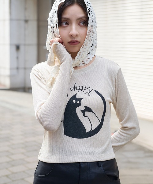 フロントにネコモチーフのCATグラフィックがデザインされたプルオーバー。ラメ感が主張し過ぎないので取り入れやすく、動くたびに微細なキラキラのグリッターが映える表情豊かなニュアンス生地です。袖口スリット入りのベルスリーブは、手元のこなれ感&抜け感を演出するだけでなく、二の腕の細見え効果も◎ガーリーなのに甘過ぎない、絶妙バランスが着回し力にも優れたアイテムです。やや短めに設定したショート丈のコンパクトなフォルムは、ワイドシルエットのボリュームボトムと相性◎