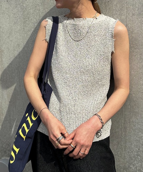 ◆Detailネック周りとアームホールにフリンジ加工を施したニットタンクトップ。シンプルに着られる一着なので一枚着としてはもちろん、ビスチェとのレイヤードやサロペットやワンピースのインナー使いにも最適。メランジ感のある奥行きのあるカラーリングも魅力です◎◆Fabric--------------------------透け感:なし伸縮性:あり光沢:なし生地の厚さ:★★★☆☆お手入れ方法:手洗い可--------------------------※汗や水、摩擦により他のものに色移りすることがありますのでご注意ください。※濃色製品は色移りすることがありますので、他の物と分けて洗濯してください。※生産時期によりサイズや質感・色味に若干の個体差がみられる場合がございます。※商品画像は、光の当たり具合やパソコンなどの閲覧環境により、実際の色味と異なって見える場合がございます。予めご了承ください。※着用、お取り扱いの際は、商品についている品質表示とアテンションタグを必ずご確認ください。◆Information欲しいitemをお気に入り登録(♡マークをclick) ・お買いのがし対策…完売itemの再入荷やラスト1点の情報をお知らせ ・欲しいitemをお得にget…pricedownになったらいち早くお知らせ ・スムーズ検索…ZOZOのお気に入りアイテムページで簡単checkできるから、再検索不要♪