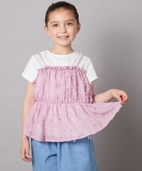 ◆フェザー風のシフォン素材が存在感のあるデザイントップス◆ 【デザイン】 ・大人気!重ね着風キャミドッキングトップス。 ・シンプルTシャツに、今季トレンドのフェザーチュールシフォン素材を使用したキャミをドッキング。 ・Tシャツとキャミソールは縫い付けてあるので動いても着崩れせず快適! ・いつものコーディネートに加えるだけでグッと今っぽいトレンドスタイルに。 ・ゴム仕様なので身体に優しくフィット!すっきり見えを叶えるきれいなシルエットに! ・シアー感のある生地で高見え。 ・クルーネックデザインで首元すっきり見え。 【素材】 ・カットソー部分…お肌にやさしいコットン100%素材。 ・キャミソール部分…チュールがリボンのように付いた、羽のようにフサフサしたシフォン素材。 【スタイリング】 ・存在感のあるトップスなので、シンプルなボトム合わせも、一気におしゃれコーデに。 ・ワイドデニムと合わせるコーデが今っぽく、大人っぽさもあっておすすめ! ・ショートパンツなどミニボトム合わせでガーリーに女の子らしいコーデも可愛い♪ ・ロングボトム合わせで少し甘さを抑えたカジュアルコーデにも! ・コーデに鮮度をプラスしたいときにおすすめ! 【カラー】 ・ラベンダー…女の子らしいけど甘すぎない絶妙なくすみラベンダー ・アイボリー…エアリー感がかわいいカラー ・ブラック…甘さの中にも大人っぽさのあるブラック ---------------- 透け感:なし 裏地:なし 伸縮性:あり 光沢感:なし 生地の厚さ:普通 ---------------- ≪お気に入り登録機能の使い方≫ ■商品のお気に入り登録(ハートマークをクリック) 再入荷通知や値下げ等、お得なご案内を受けることができます。 ※WEB・一部店舗限定販売です。 ※同じデザインの140サイズ/150サイズ/160サイズがございます。 140サイズ/150サイズ商品コード:KJKFB07039 160サイズ商品コード:KJKFC07044 ---------------- ※サンプルでの撮影となるため、実際にお届けする商品と仕様やサイズが異なる場合がございます。 ※商品画像は、光の当たり具合やパソコンなどの閲覧環境により実際の色味と異なって見える場合がございます。 商品の色味の目安は商品単体の画像をご参照ください。