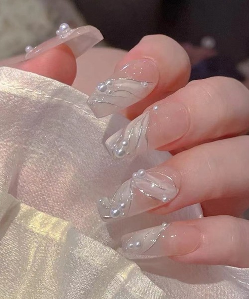 羽や花びらを思わせる、上品なアートが描かれたネイルチップ。 淡めカラーをベースにした肌馴染みの良い配色で、オフィスやセレモニーなどのオンコーデにもお使いいただけるアイテムです。 アクセントには小粒のパールを散らし、華やかな印象に。 女性らしいコフィンフォルムも美しく、指先をすらりと長く見せてくれるのもポイントです。 セットは簡単なシールタイプを採用。 その日限りでオフができるので、お仕事でネイルがしづらい方や特別な日のオシャレにもおすすめです◎ 【セット内容】 ・ネイルチップ 10枚 ・粘着シール 24枚 ・ネイルファイル 1個(色ランダム) ・ウッドスティック 1個(色ランダム) ■使用方法 ①消毒用エタノール等で爪の油分や汚れをふき取る ②粘着グミタイプ:適切なサイズの粘着グミを爪に貼り、表面フィルムを剥がす グルータイプ:ネイルチップの裏側に適量にグルーを塗る ③爪の根元からネイルチップを付ける ④20秒ほど押さえてフィットさせる ■長持ちの秘訣 ・ネイルチップを貼る前に、反射点やグリースがなくなるまでネイルファイルで爪を磨きます。 ・爪よりも少し小さめのネイルチップをお選びください。 ・粘着グミが温かいと粘着性が高くなります。寒い時期はドライヤーなどで温めてからご使用いただくとより効果的です。 ・ネイルチップと爪の間の空気を抜くように指でギュッと押さえると、さらにしっかりと密着します。 ・効果を長持ちさせるため、粘着後2時間は水に触れないようにしてください。 ■外し方 ウッドスティックを自爪とチップの間に少しずつ差し込み、ゆっくりと剥がしてください。無理やり剥がすと爪が痛む原因となります。 ※剥がしにくい場合は、外す前に指をぬるま湯に5~10分程浸すか、ウッドスティックにオイルなどを含ませてから行うと効果的です。 <注意点> ・色合いはモニター環境により若干の誤差が出ます。 ・サイズは平置きにして測定していますが、測り方によって誤差が出る場合がございます。 ・入荷・生産時期により、色、サイズ、素材など多少異なる場合がございます。