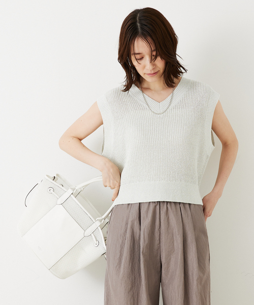 ザックリが新鮮な夏ニット!【Design】ざくっとした片畦編みのニットベスト。前後着用可能なので襟ぐりの違いを2種類楽しめます。丈を少し短丈にし、横幅をワイドに作っているのでゆったり着やすいシルエット。レイヤード次第でどんなボトムでもスタイリングしやすいです。【Fabric】麻調の清涼感のある糸を使用。さらっとしていて真夏に着ても爽やかな着心地の良い素材感です。ホワイトとブラックにはシルバーのラメがMIXしているので、さりげなく上品な光沢があります。【Styling】ベストとして袖ありのインナーとの重ね着も◎夏はベアトップなどでサラッと1枚でヘルシーな着こなしで。夏ニット/サマーニット/ラメニット/ベスト/重ね着/レイヤード/夏物/レッド/ブラック/シルバー/**********************透け感:ややあり裏地:なし伸縮性:あり光沢感:なし生地の厚さ:普通**********************