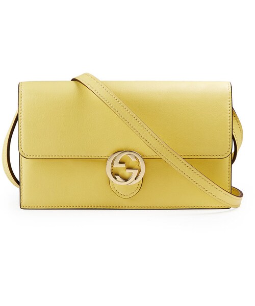Gucci leather wallet with interlocking "G" detail. Light fine golden hardware. Adjustable and removable shoulder strap with 23.6" drop. Snap button closure. Interior zip pocket and ten card slots. 4"H x 7.4"W x 1.4"D. Made in Italy.