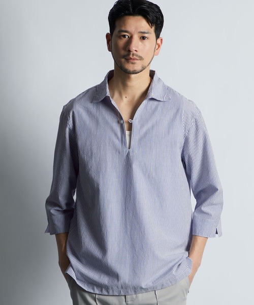 "涼し気で清潔感のある大人シャツ"【生地】シアサッカーストライプ生地を使用しています。肌離れがよく清涼感があり、シアサッカー地特有の凹凸感のある織りによってできる立体的な表情も見どころのひとつです。【デザイン・ディテール】通気性の良いラフな素材感を活かし、リゾートスタイル風の7分袖スキッパーデザインになっています。サイズ感もややゆったりとしているので、リラックスしたファッションをお楽しみいただけます。※サンプルを着用しておりますので、実際の商品と仕様、加工、サイズが若干異なる場合がございます。※撮影環境による光の当たり具合やパソコン・スマートフォンなどの閲覧環境によって、実際の色味と異なって見える場合がありますので予めご了承ください。※商品の色味は商品単体で撮影した画像をご参照ください。