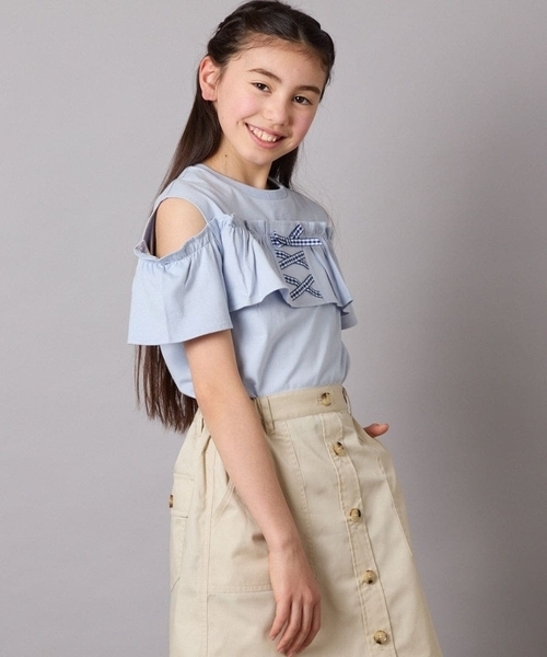 ◆胸元のリボンとフリルがかわいい◆ 【デザイン】 ・これからの季節にぴったり!涼し気なオフショルTシャツ。 ・さりげなく、ヘルシーな肩見せがおしゃれポイント。 ・胸元のフリルが華やかでお出かけにもぴったり。 ・フロントのレースアップが女の子らしさを引き立てる! ・袖のフリル部分はゴム仕様なので、動きやすく、快適な着心地。 ・クルーネックデザインで首元もすっきり見え。 【素材】 ・真夏にうれしい接触冷感素材。 ・毛玉になりにくく、お肌にやさしいコットン100%素材。 【スタイリング】 ・一枚で着映える半袖Tシャツなので、様々なコーデを楽しめる! ・ワイドパンツなどのロング丈のボトムと合わせるコーデが今っぽく、大人っぽさもあっておすすめ! ・ミニボトムやサンダルとのコーディネートも夏らしく涼し気ヘルシーでおすすめ。 ・程よい肌見せ感で、通学にはもちろんお出かけにもぴったり! ・裾をボトムスにインして着てもごわつかず、すっきりしたメリハリのあるスタイリングが叶う! 【カラー】 ・ライトブルー…甘さ控えめのさわやかかわいいライトブルー ・ラベンダー…オトナ可愛い雰囲気の上品なラベンダー ---------------- 透け感:なし 裏地:なし 伸縮性:あり 光沢感:なし 生地の厚さ:普通 ---------------- ≪お気に入り登録機能の使い方≫ ■商品のお気に入り登録(ハートマークをクリック) 再入荷通知や値下げ等、お得なご案内を受けることができます。 ※WEB・一部店舗限定販売です。 ※同じデザインの140サイズ/150サイズ/160サイズがございます。 140サイズ/150サイズ商品コード:KJKGB51029 160サイズ商品コード:KJKGC51034 ---------------- ※サンプルでの撮影となるため、実際にお届けする商品と仕様やサイズが異なる場合がございます。 ※商品画像は、光の当たり具合やパソコンなどの閲覧環境により実際の色味と異なって見える場合がございます。 商品の色味の目安は商品単体の画像をご参照ください。