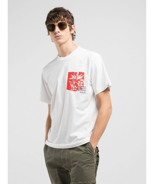 コットンジャージークルーネックTシャツ。左胸にレッドカラーのアロハプリントのポケットとレタリングプリントを施し、左袖口にはアイコンのアーカイブロゴタグをプラス。レギュラーフィット