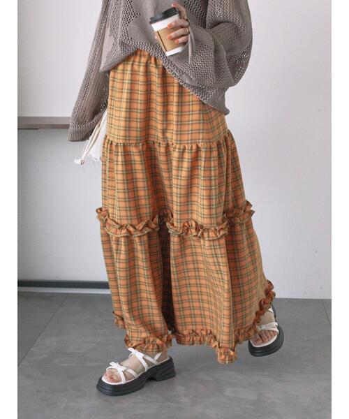 チェック柄のデザインがシーズンムードを演出するスカート。ティアード切り替えを施すことで、ふんわりとしたボリューム感をプラスします。ゴム仕様のウエストがフィット感のある穿き心地を実現。無地のトップスと合わせたバランスの良いコーディネートもおすすめです。※商品画像は、撮影環境やお客様のご利用のPC・スマートフォンのモニター環境などにより実物と色味に差異がある場合がございます。※発売予定は数日前後する場合がございます。予めご了承ください。【その他採寸】F ウエスト:[ゴム仕様]62cm