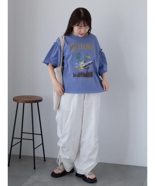 ヴィンテージ加工のプリントデザインが個性をプラスするTシャツ。ギャザーを施したフレア感のあるスリーブも、愛らしい印象を演出してくれます。ゆったりめのシルエットで気になるボディラインも優しくカバー。カジュアルスタイルのアクセントとしても活躍してくれる1着です。