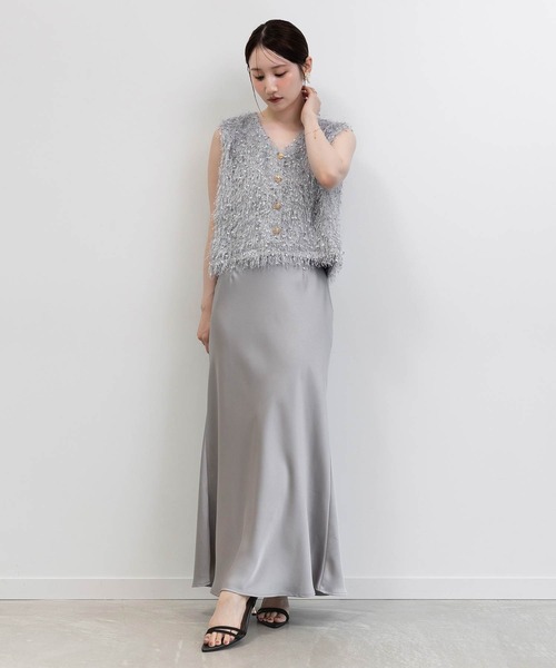 ◆2025SS新商品◆ ふんわりシャギー素材のトップスとサテンナロースカートのセットアイテム。 セットで着用すれば簡単にコーデが完成し、それぞれ単体でも着用可能なのでマルチに着こなしていただけます。 POINT 【トップス】 ・軽やかでありながら存在感を放つシャギー素材を使用 ・顔回りをすっきりと見せてくれるVネック ・適度にゆとりのあるシルエット 【スカート】 ・上品なツヤ感を放つサテン生地 ・女性らしさを引き立てる美しいナローシルエット ・腰回りはすっきりとさせ、裾に向かって自然に広がるこだわりのライン COORDINATE セットでの着用はもちろん、それぞれ単体でも着用できる着回し力抜群のマルチウェイアイテムです。 - - - - - - - - - - - - - - - 【トップス】 洗濯方法:家庭洗濯可 透け感:なし 裏地:あり 伸縮性:ややあり 生地の厚さ:普通 【スカート】 洗濯方法:家庭洗濯可 透け感:WHITEややあり、その他なし 裏地:あり 伸縮性:なし 生地の厚さ:普通 - - - - - - - - - - - - - - - 【スカート】 0:着丈91/ウエスト61~75/ヒップ93/裾周り154 1:着丈95/ウエスト64~78/ヒップ96/裾周り157