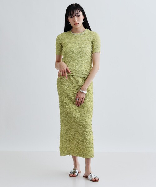 Design Point 立体感があり、個性を演出するふくれジャカードのタイトスカート。 シルエットはシンプルでありながらも、柔らかさを持ったデザインです。 バックのスリットが軽快で女性らしい動きを引き立てています。 Styling Point 同素材のトップス(商品番号:523-12025)とのセットアップスタイルがおすすめ。 オーバーサイズのトップスと合わせてボトムをタイトにまとめたい時にも重宝します。 凹凸のある素材がのっぺりと見せず、夏の軽いコーディネートでもほどよいアクセントになります。 Fabric Point 軽やかで自然なストレッチ性があるふくれジャカード素材を使用。 独自のテクスチャーで個性のある素材感です。 ***************************** \\気になるアイテムはお気に入り登録がおすすめ// 気になるアイテムのページにある「ハートマーク」をクリックして簡単に追加できます。 登録すると、再入荷通知やお値下げ情報をメルマガにてお知らせ! マイページにてお気に入り一覧もチェックできます。 ***************************** ※照明の関係により、実際よりも色味が違って見える場合があります。また、パソコン・スマートフォンなどの環境により、若干製品と画像のカラーが異なる場合もございます。 店舗へのお問い合わせ商品番号:523-72004 ●製品寸法: 36(S):W62cm H91cm 裾幅45cm 総丈86cm 38(M):W65cm H93cm 裾幅46cm 総丈88cm 備考: