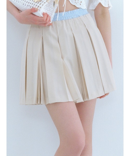 スーツ生地のプリーツミニスカート風デザインを、ショーパン型の裏地を付けてスカショーパンとして作成しました。ウエストは別のボトムをレイヤードしているように見える仕様でデザインのアクセントになっています。プリーツ部分のウエスト切り替えは切りっぱなしになっているので、少しモードな雰囲気が感じられます。 透け感;なし 裏地;あり 伸縮性;なし 光沢感;なし 生地の厚さ;普通 ※照明の関係により、実際よりも色味が違って見える場合があります。 またパソコン・スマートフォンなどの環境により、若干製品と画像のカラーが異なる場合もございます。予めご了承ください。 商品の色味は、商品単品画像をご参照下さい。 ※商品画像はサンプルのため、色味やサイズ等の仕様に変更がある場合がございますので、予めご了承ください。