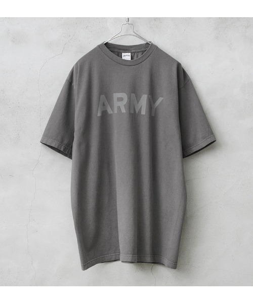 HOUSTON ヒューストン ピグメント ARMY プリント 半袖Tシャツのご紹介です。 品名:PIGMENT PRINT TEE(ARMY) 品番:22305 HOUSTONから、5.6オンスのコットンにピグメント加工を施した半袖Tシャツが登場しました。 フロントには「ARMY」のインパクトあるプリント。米軍で採用されていたトレーニングTシャツをサンプリングし、夜間での着用時でも視認性を高めるリフレクタープリントになっています。 もたつかず動きやすいジャストなシルエット。色落ちや洗濯による劣化が少なく、長期間使用できるピグメント加工のビンテージアイテムのような独特な風合いは、こなれた印象と遊び心を感じさせます。 春夏にふさわしいトロピカルカラーをくすませた他にはない色展開も魅力。女性でも違和感なく着用可能です。ロゴや色合いが目を惹き、インナーでも一枚でも一目置かれるプリントTシャツです。 ※製品染め商品の特性上、一点一点染め上がりのお色やサイズに若干の誤差がございますので予めご了承ください。また、独特のユーズド感のある表情、多少のゆがみや擦れ、縫い目部分のしわ、編み地の筋やムラなどは製品の特徴です。素材の持つ不均一感やラフ感をお楽しみください。