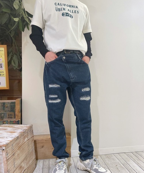 11oz ムラ糸インディゴデニムを使用したサルエルパンツ。 特殊な洗い加工やダメージ加工を施す事で、ヴィンテージ風の外観に仕上がっています。 オーバーサイズのペインターパンツを、リメイクした様なディテールがポイントです。