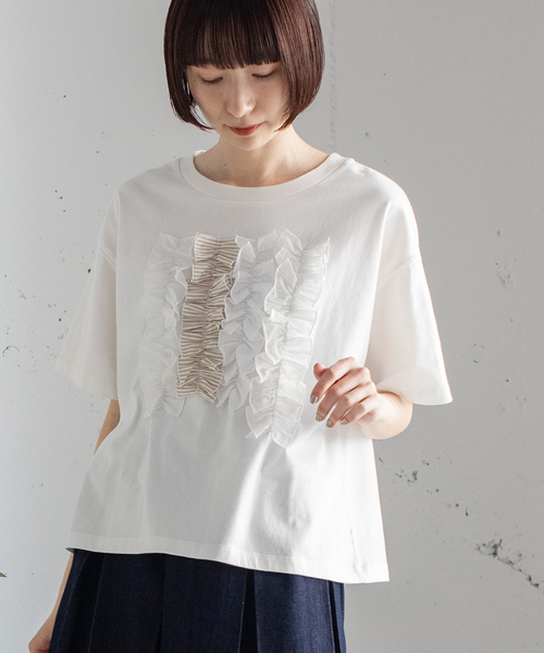 ■Pointコンパクトなサイズ感のTシャツのフロントに、4種類のフリルをランダムな長さに叩き付けたTシャツ。コンパクトでありながら、アームホールが大きめなので着脱しやすくなっています。同色系のフリルにアクセントのストライプがポイント◎--------------------透け感:ややあり(オフホワイト)厚さ:普通伸縮性:あり--------------------◆注意事項◆可能な限り実物に近いカラーにて掲載しておりますが、ご使用のパソコンやスマートフォンなどの端末の環境によって、実際の色味と異なって見える場合がございます。予めご了承ください。サンプルで撮影している商品もございます。その場合、実際の商品とは色味・仕様が異なる場合がございますので、予めご了承ください。POU DOU DOU プードゥドゥひと手間加えた存在感のある「日常着」いつまでもときめきとかわいいを忘れない方への愛着を持てるワードローブ= お気に入り登録がおすすめ!=お得な情報をいち早くお届け致します。アイテムをお気に入り⇒ SALE START / 完売COLOR再入荷 / LAST1点 etc...ブランドをお気に入り⇒新商品 / 再入荷 /クーポン・セール情報 etc...