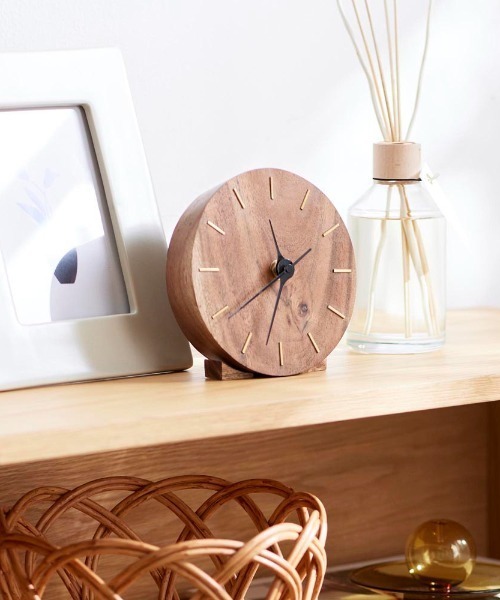 置き時計にも壁掛け時計にもなる2WAY時計 自然の温もりを感じる木材と、上品な輝きを放つ真鍮が融合し、どんな空間にもすっと溶け込むシンプルでモダンなデザインが魅力。 転がりを防ぐストッパー付きで、置き時計として使用するときも安定感抜群。飾る場所を選ばず、ライフスタイルに応じた時計の楽しみ方が可能です。 コロンと丸い形が優しい印象に。専用BOX入りでプレゼントにもぴったりです。 [サイズ] 直径14×奥行4cm ストッパー:幅2.5×奥行2×高さ1.5cm [商品詳細] ・組み立て商品 ・単3乾電池1本使用(別売) ・デザインボックス入り [ご注意ください] ・素材の特性上、ひとつひとつ節や木目、色の濃さにバラつきがあります。キズがつきやすく気候・環境の変化などで収縮や反り、多少の割れ目がある場合があります。 ・すべて手作り品の為、サイズや色・仕上げに若干の個体差があります。 ・表面には、風合いや手触りを損なわないように必要最小限のコーティングを施しています。 ・乾いた布でのお手入れをおすすめします。水拭きすると、色移りする場合があります。 ・直射日光や冷暖房器の送風などが直接当たらないようにしてください。ゆがみなどの変形や変色、腐りなどの原因になります。