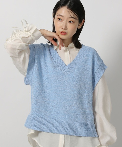 レイヤードスタイルに活躍するニットベスト。フレンチスリーブデザインですっきりと見え、ジャストの着丈はバランス良くスタイリングでき〇さりげなくプラスされたスパンコールもポイントになった1点です。【素材】柔らかなニット素材。薄手の素材感なので気温の高い時期にも使いやすいです。【スタイリング】1枚着としてはもちろん、Tシャツやシャツとのレイヤードなど幅広く活躍します。