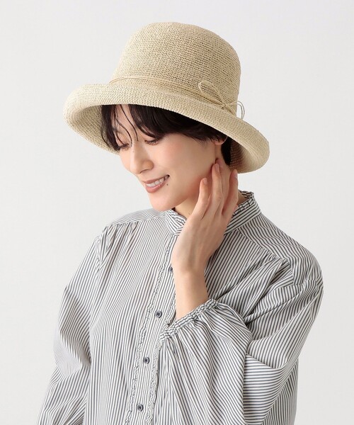 ナチュラルな風合いのペーパー素材を使用した、軽やかなハットです。 くるんと上がったツバがかわいらしさを演出。華奢なリボンモチーフで上品さをプラスしました。主張しすぎない落ち着いたデザインで、幅広い年代の方にご愛用いただけます。 紫外線遮蔽率71%以上のUVカット機能付きで、日差し対策にぴったり。ツバが広めなので日差しをしっかりとカバーし、小顔効果も期待できますよ。お買い物やお出かけなど、さまざまなシーンで活躍してくれます。カラーはアイボリー、ライトブラウン、ライトグリーンの3色から好みや気分に合わせて選んでくださいね。 紫外線遮蔽率/71%以上 お洗濯はお避けください。 この製品は樹脂ワイヤーを使用しています。繰り返しの使用などにより、ワイヤー先端が飛び出す場合がありますので、ご注意ください。破損した場合は直ちに使用を中止してください。 高さ10cm/つば8cm/頭周り(最大)57.5cm