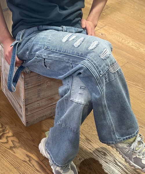 11oz ムラインディゴデニムを使用したサスペンダーパンツ。 特殊な洗い加工やダメージ加工を施す事で、ヴィンテージ風の外観に仕上がっています。 オーバーサイズのオーバーオールを、リメイクした様なディテールがポイントです。