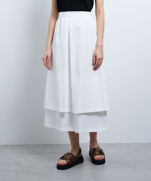 ◇デザイン ストレスフリーのウエストゴムスカート。 スカートを重ねているようなレイヤードデザインに、フロントタックやバックスリットでニュアンス感があります。 広がりすぎずスッキリ見える適度な分量感で履き心地も抜群です。 ◇ファブリック 合成繊維の一大産地、北陸・能登で織られたナイロングログラン。 適度なハリと光沢があり、特殊シワ加工「スナバック」により、ナチュラルな表情や上品な落ち感もあります。 カジュアルとラグジュアリーが絶妙に融合した素材です。 撥水機能もポイントです。 ------------------------------ 裏地:あり 光沢感:ややあり 伸縮性:なし 生地の厚さ:やや薄手 透け:なし 重さ:軽い ポケット:ポケット 洗濯:手洗い可 ------------------------------ ◇コーディネート インスタイルもすっきりと着られるウエストゴムのスカート。 ロングシーズン使えるので足元で季節感をプラスするのがおすすめです。 ◆商品画像はサンプルのため、デザイン、素材(混率等)、色味やサイズなどの仕様に変更がある場合がございますので予めご了承くださいませ。 <素材>本体:ナイロン100% 別府:ポリエステル100% <原産国>中国 <サイズ> 36:ウエスト63 ヒップ(内)97 ヒップ(外)112 裾周り(内)143 裾回り(外)157 38:ウエスト66 ヒップ(内)99 ヒップ(外)115 裾周り(内)146 裾回り(外)160 model オレンジ/オフ:H175 B78 W60 H89 着用サイズ:38 ブラック:H176 B74 W58 H88 着用サイズ:38 ※定価(税込)は、2025年6月27日のセール開始前の店舗における販売価格です。