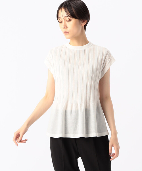 《デザイン》ランダムリブとペプラム状のフレアが女性らしいシルエットの ニットプルオーバーです。甘さのあるフレアデザインながら、身頃のすっきりとしたリブうねとコンパクトなフレンチスリーブで甘さを削ぐことにより、大人が品良く着ることのできるシルエットを目指しています。ペプラムのドレープ感が気になる腰まわりをカバーしながらきれいなスタイルをつくります。《素材》トレンドの光沢素材です。原料は柔らかなトップ染めのビスコース繊維と極細の多色スパークフィラメントのポリエステルを撚糸した糸です。ラメとは違う上品な光沢が特徴で、透け感がありつつも編地にはりがあるので肌離れの良い爽やかな素材感です。お手入れ方法:手洗いOK