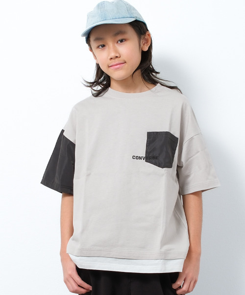 CONVERSE 別注フェイクレイヤードポケットTシャツ右袖と胸ポケットを別布で切り替えアウトドア要素を取り入れたCONVERSEフェイクレイヤードTシャツ。裾をフェイクレイヤードにすることでオシャレ感もUPさせています。キッズらしい配色でトドラーからジュニアまでオススメのTシャツです。