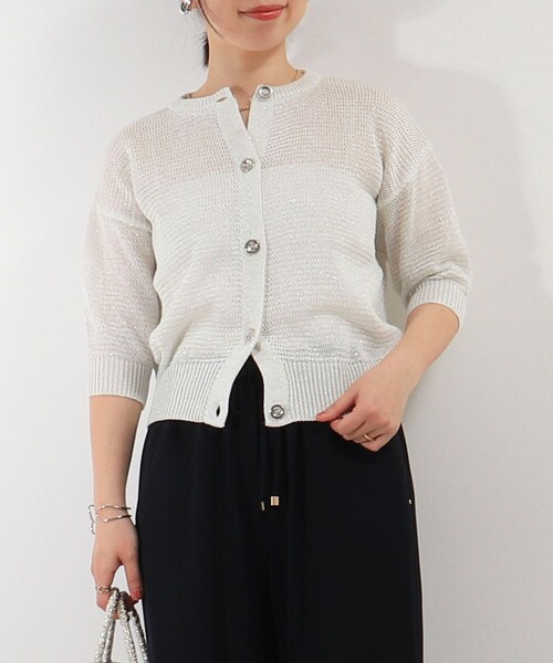 ◇25SS◇MICO COULIER◆Point・春夏の定番ギマ素材を使ったMADE IN JAPANの価値あるカーディガン・サックリとした編地で清涼感があり夏にも涼しく着られる1枚・メタル釦とラメ糸を編込んだ素材が華やかで涼しげ・コンパクトな丈感と肘下ほどの5分袖でワンピースの羽織りにも◎・インナーにタンクトップを合わせてメッシュトップスのように一枚着として着るのもおすすめです・きれいめスタイルに合うサッと羽織ってサマになるアイテム----------------------------------------------------------透け感:あり裏地:なし伸縮性:あり光沢感:なし洗濯:手洗い可----------------------------------------------------------●お取扱い上のご注意●末永くご愛用頂くために、アテンションタグを必ずご確認の上、着用又はお取り扱い下さい。気になる商品は、お気に入り登録がオススメです!クーポン情報、入荷情報が、通知されるようになります。※店頭及び屋外での撮影画像は、光の当たり具合で色味が違って見える場合があります。商品の色味は、スタジオ撮影の画像をご参照下さい。※商品画像に関しては出来る限り忠実に表示出来るよう努めておりますが、お客様がご利用のモニターの設定及び特性により、実際の商品と比較し色味に若干の誤差が生じる場合があります。※製品洗い加工の商品は、多少の歪み、シワなどが見られたり、風合いやサイズ等が1枚1枚異なります。汗や雨等で濡れた時や、摩擦により色落ちし、他の衣料を汚すことがありますので(特に濃色のもの)ご注意ください。