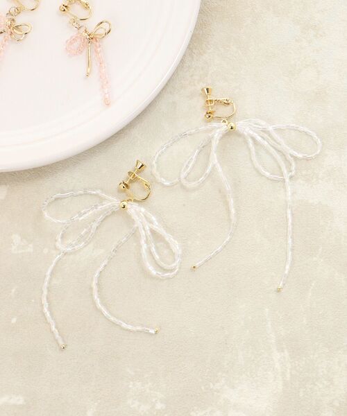 透明感のあるクリアビーズと、可愛らしいリボンモチーフが魅力的なイヤリング。シンプルながらも、ビーズの繊細な輝きが顔まわりを明るく華やかに演出します。程よい大きさで存在感があり、特別な日や、日常のおしゃれのアクセントに◎■商品のお気に入り登録 再入荷通知やのこりわずか、お得なプライスダウンの情報も受け取ることができます。ぜひご登録ください◎*商品の実測サイズはオフです。[ピンク]タテ5.3cm/ヨコ2cm