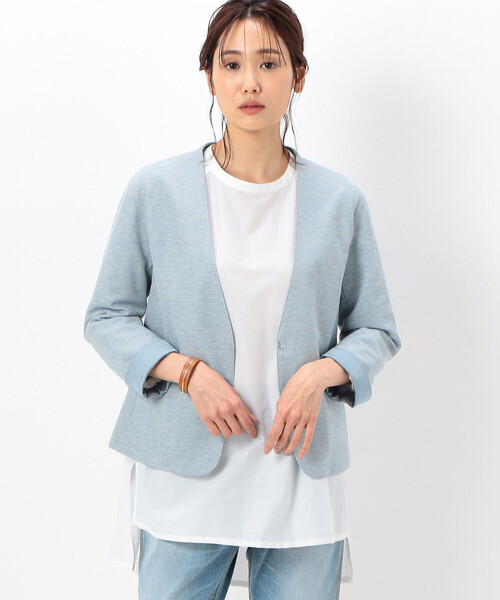 《デザイン》ジャケットのようなきちんと感と、ジャージーのような快適な着心地を併せ持ったジャケットです。カーディガンのような軽いジャケットで、上品で快適に着られます。エフォートレスなボックスシルエットのジャケットを、後ろウエストでシェイプさせ女性らしさをプラスしています。身幅、肩、袖幅丈にゆとりがある快適なシルエットながらも、後ろウエストのみをゴム入りギャザーで程よくフィットさせています。見返しには薄いサテンを使用しているため、袖はワンカールしてサテンを見せると華やかな印象です。裏面はポリエステルの色に合わせたパイピング始末ですっきりとしたデザインです。《素材》麻のナチュラル感をいかした凹凸感のある組織で、夏のツイードをイメージしたデザインです。カノコ組織をベースに、リネンとポリエステルが格子状に出現する変形編みの素材です。ジャージーの特性をいかし、表面の麻をループ状に編むことで、麻のナチュラルな風合いと清涼感を実現しています。疎水性があり、汗を逃がすのでさらさらの肌触りをキープします。特殊な後加工で固めの風合いにし、ジャージーのリラックス感をKTらしく上品に仕上げています。