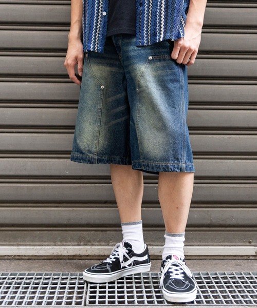 丈が長く穿きやすいデニムショーツ。 ワイドなシルエットでリラックス感もあります。 フロントに大きなポケットを貼り付けたようなデザインがポイント。 加工感もしっかりしていて長年穿きこんだような味わいをはじめから楽しめます。 【素材】 肌触りの良い綿100%素材。 【スタイリング】 カジュアルな着こなしと相性〇 トップスのシルエットをすっきりさせてもメリハリのついたスタイルになります。